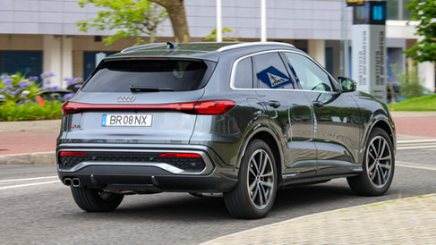 Esteticamente, este Q5 com imagem robusta é Audi da “cabeça dos pés”, talvez por partilhar diversos elementos de estilo com o Q6 e-tron, SUV disponível só com motorizações elétricas. Na versão ensaiada, com o Pacote S line (1550 €), o carro tem imagem ainda mais desportiva, por contar com grelha “Singleframe” e entradas de ar laterais específicas. E, somando-se-lhe o Pacote Tech Pro (8730 €), ganha sistema de iluminação muito moderno que assegura maior grau de diferenciação, por contar com faróis LED Matrix e farolins OLED (têm oito assinaturas luminosas). O desenho desportivo também é sublinhado pelas jantes de 20’’ com cinco raios duplos Audi Sport (2965 €), que têm impacto direto nas emissões de CO2 e no preço a pagar. De série, rodas de 18’’.