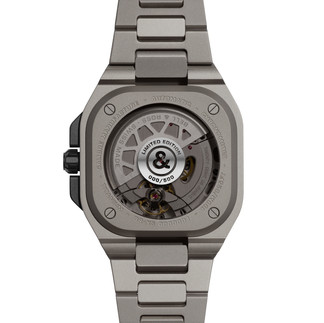 Na versão Racing nova do BR-X5, a arquitetura da caixa, devido aos diversos componentes que combina, expressa, precisamente, leveza e resistência, associando-lhes o radicalismo do desenho. Atravessam-na quatro parafusos em titânio (assim, fixa-se esta construção do tipo “sanduíche”). Duas placas em titânio de grau 2, material muito utilizado em ambiente indústria, devido à resistência à corrosão e mecânica, envolvem monobloco fabricado em titânio com revestimento DLC de cor preta, elemento que abriga tanto o movimento como os protetores da coroa. E, no topo do relógio, encontra-se uma luneta quadrada com duas partes – uma placa em carbono entrançado integrada num corpo em titânio. Finalmente, a bracelete em titânio ou borracha encontra-se presa a duas placas independentes na caixa, com elos que proporcionam uma ergonomia perfeita.