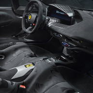 No interior, os acabamentos personalizados da Ferrari Tailor Made para esta unidade incluem estofos em tecido “Q-Cycle” desenvolvido a partir de pneus reciclados, cintos de segurança coloridos e logótipo bordado a amarelo em todos os apoios de cabeça. O painel de instrumentos e a coluna de direção possuem grafismos inspirados nas bandeiras de xadrez e são fabricados com a mesma fibra de carbono utilizada pela Scuderia na Fórmula 1.