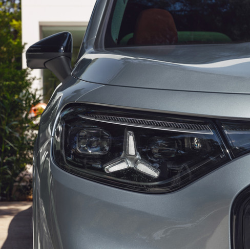 Em opção, este GLB novo, como acontece no CLA, pode apresentar-se com grelha que integra 97 estrelas e o símbolo da marca retroiluminadas (conduzindo à noite, e por contar com identidade visual diferenciada e diferenciadora, o SUV sobressai na paisagem automóvel). Existem três linhas de acabamentos (Progressive, AMG e AMG Plus) e muitos pacotes de equipamentos (Pack Nigth, por exemplo) e admite-se a personalização do exterior e do interior de carro com tejadilho panorâmico de série (opcionalmente, pode contar com Sky Control que adapta a opacidade e, em ambientes noturnos, ou com muito pouca luz, “acende” 158 estrelas na superfície de vidro, o que beneficia a impressão de bem-estar no interior).
