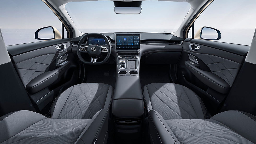 O interior do MGS6 EV pauta-se pela apresentação bem cuidada e tecnológica, com a marca empenhada na promoção da perceção de qualidade tanto na construção, como nos materiais, a maioria macios e, por isso, agradáveis à vista e suaves ao toque. Os bancos dianteiros apresentam-se com sistemas de aquecimento e ventilação (os traseiros também dispõem de aquecimento) e têm revestimentos que combinam Alcantara e couro sintético. Ainda no equipamento, tejadilho panorâmico com 1,92 m2 (e cortina elétrica) e iluminação ambiente. Anunciam-se duas opções de acabamento para o interior: cinzento e bege (a segunda obriga a um investimento suplementar de 1000 €).